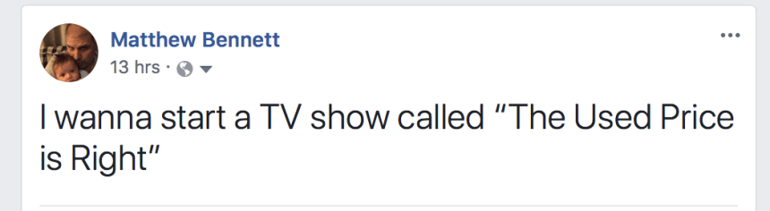 Since it’s used stuff, there really is no standard pricing – it’s based on how much the person wants the money, and how willing they are to part with the stuff. So, you get three people who are trying to sell something, and a contestant is called from the audience. The contestant gets to ask one question of each seller in order to gauge how much she thinks they will sell it. It can be any question, about anything, but it can’t involve the price of the item. If the contestant guesses within a certain dollar value, she gets to keep the item, and the sellers will be paid by the game show.